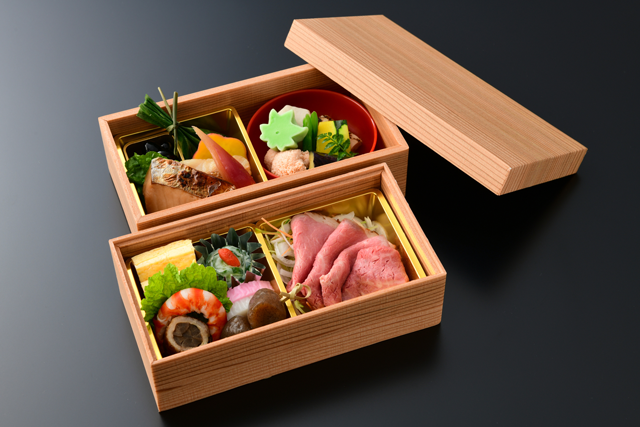 - 鰆幽庵焼き、鯛若狭焼き、黒豆(金箔)、丸十、酢茗荷、小芋、茄子、南瓜